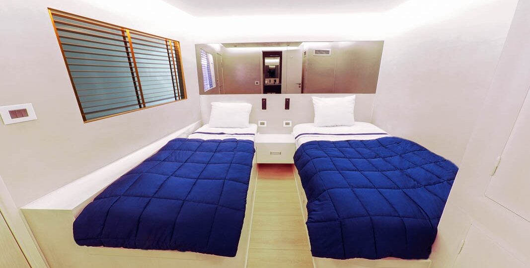 كابينتان مزدوجتان مع سريرين مفردين مع نافذة مسدودة. تحتوي جميع الكبائن على تكييف مع تحكم منفصل وحمام خاص.