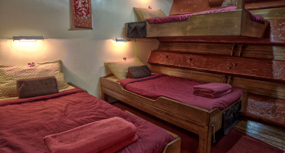 2 Kabinen mit drei Betten (die als geteilte Zweibettzimmer genutzt werden können und auch in ein privates Doppelbett umgewandelt werden können). Alle unsere Kabinen sind voll klimatisiert und verfügen über eine eigene Warmwasserdusche und ein eigenes WC.
