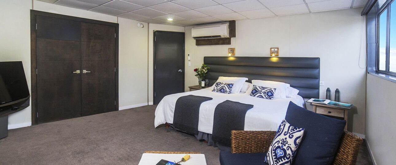 Nos 2 suites premium sur le pont principal sont très spacieuses avec de grandes fenêtres extérieures, un coin salon, une télévision à écran plat, une climatisation à réglage individuel et une salle de bains avec double vasque. Peut être configuré avec un lit king californien ou deux lits doubles (Emerald & Cortes).