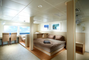 Notre seule et unique cabine est de loin la plus grande cabine à bord. Parfait pour les voyageurs qui souhaitent le plus grand confort tout au long de leur croisière.