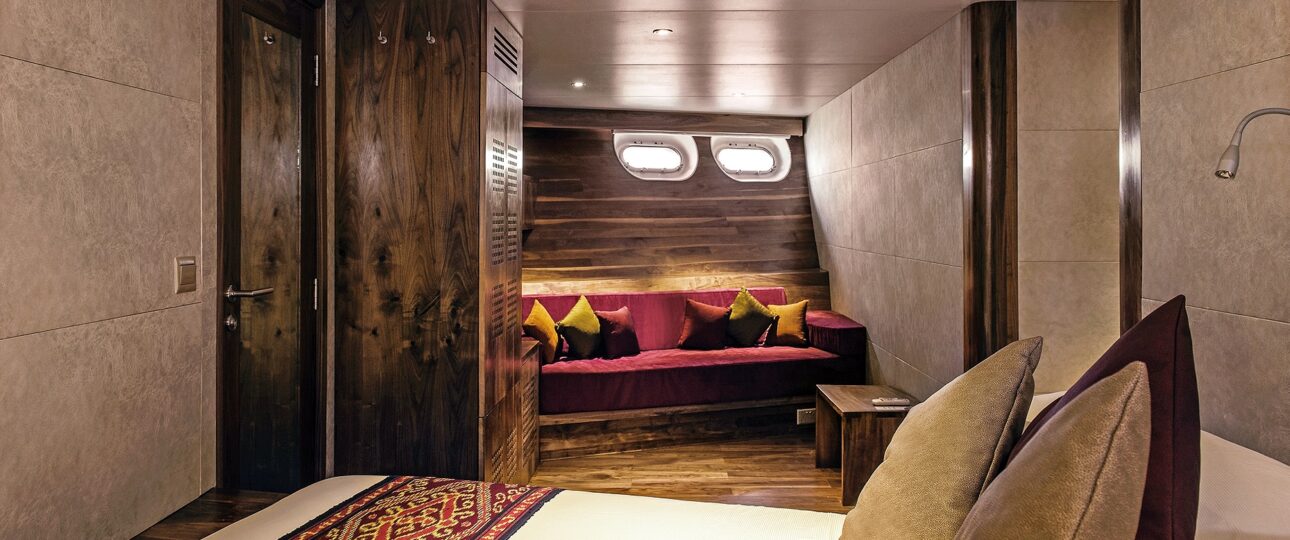 Cowrie Suite는 하부 데크의 뱃머리에 아늑하게 자리잡고 있습니다. 이 특별한 스위트룸은 각진 패널 벽과 독특한 모양을 갖추고 있습니다. 퀸 사이즈 침대와 화려한 루비색 소파가 있어 편안한 세 번째 침대로 변신하실 수 있습니다. Cowrie Suite는 선수의 너비에 걸쳐 있기 때문에 4개의 개방형 포트라이트가 있고 넓은 실내 욕실에는 선상에서 가장 큰 샤워 시설이 있습니다.